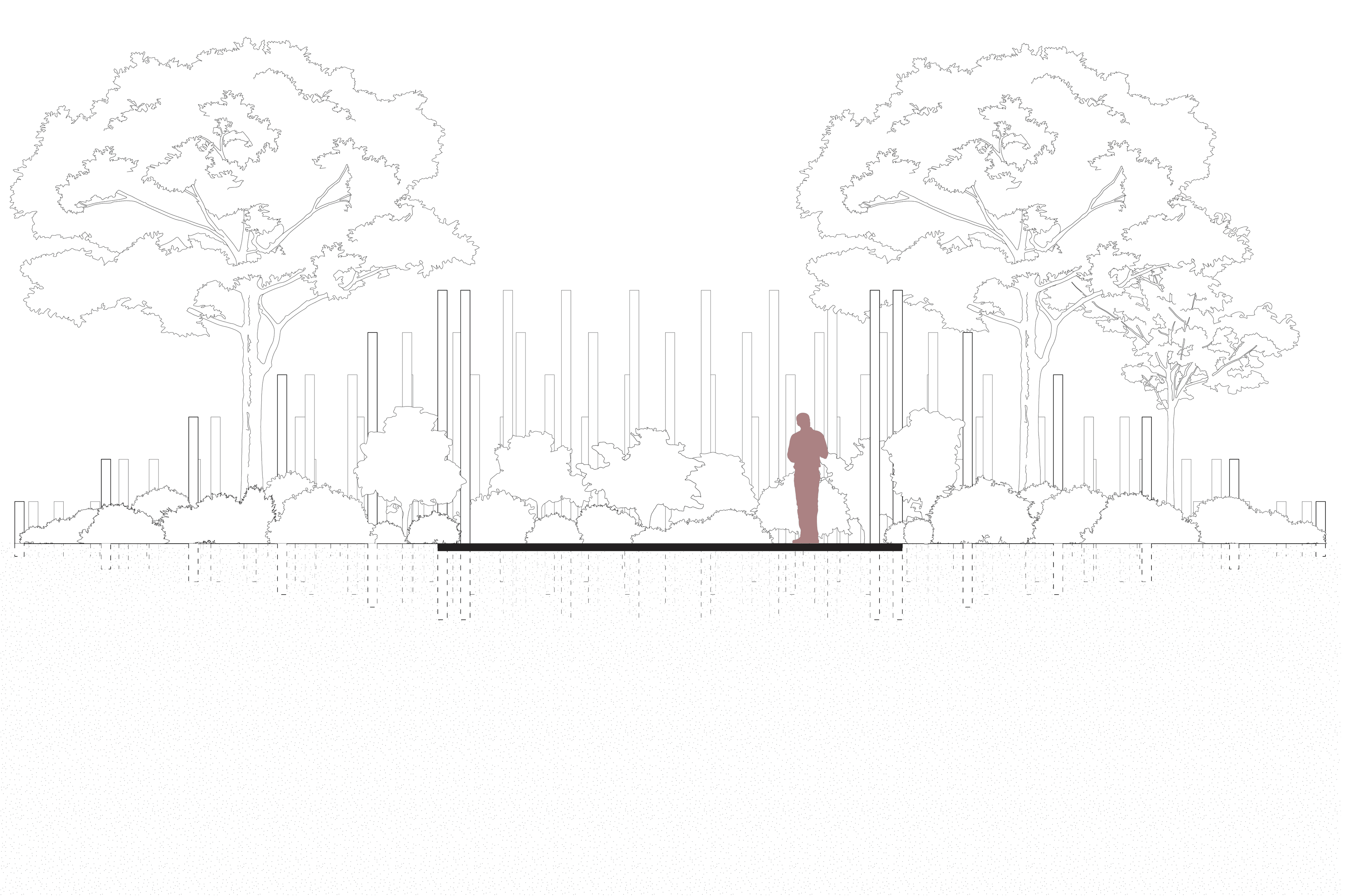 A second module is proposed in order to provide a greater sensorial experience. Utilizing a similar design language to the first intervention, the columns in this intervention are instead made of thin aluminum pipes which are intended to create musical sounds when struck. Combined with the fragrant scents of flowering bushes, these columns, scattered randomly and at different heights throughout the module, would create an interactive sensory garden.