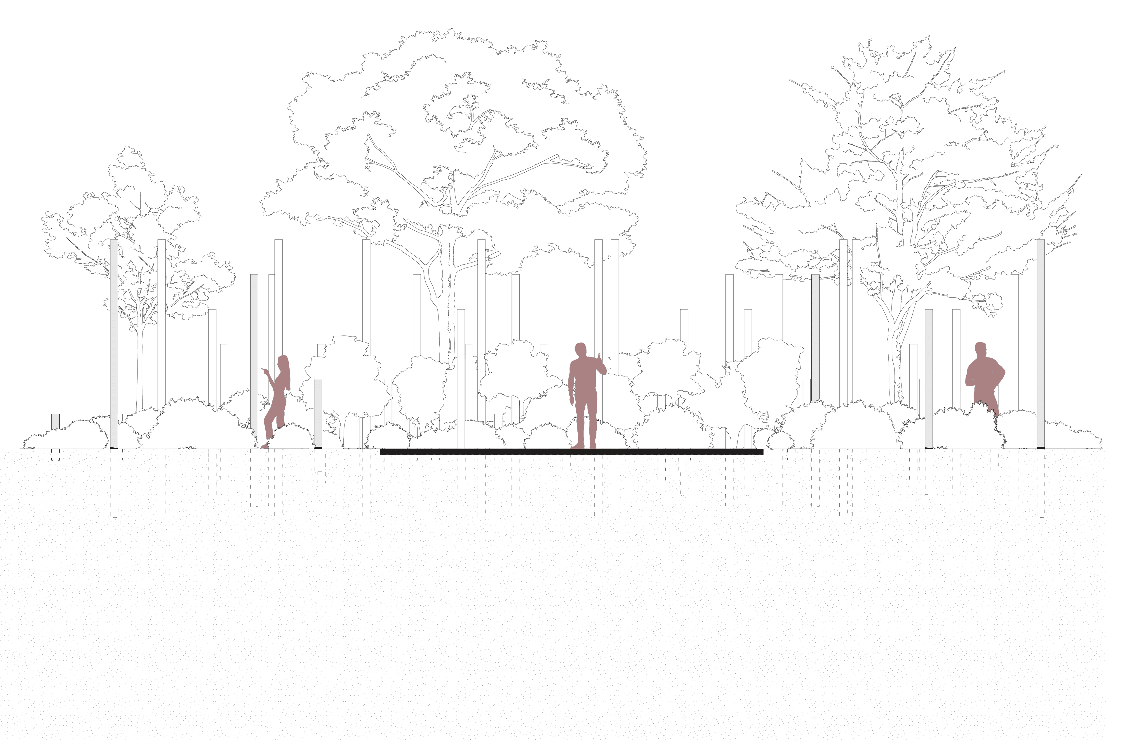 This proposal aims to emulate the density of a natural forest amongst the existing flat topography through the introduction of pollinator-friendly shrubbery.